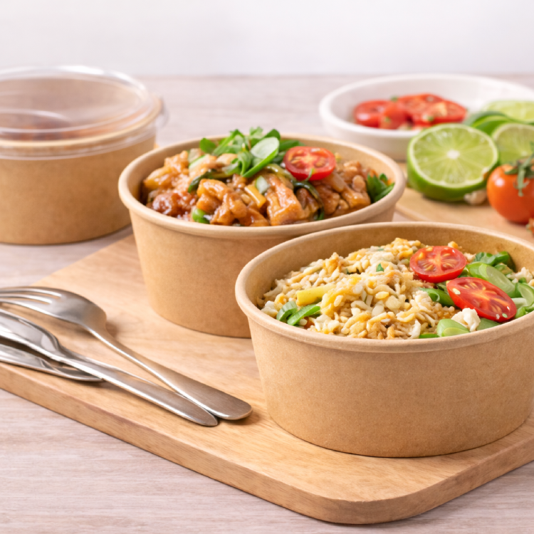 - Nắp giấy Kraft: Dùng cho thực phẩm khô, tạo sự đồng bộ "Full Kraft" bảo vệ môi trường tối đa.